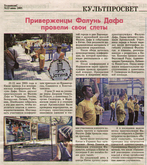 基辅市当地报纸《TEXNOPOLIS》于第23期的文化专栏报导了这次法会活动的整个过程,包括游行、炼功、音乐会和中共使馆前烛光守夜等。报导中讲到中共对法轮功的迫害已经导致2000多人死亡。同时提到在“乌克兰橙色革命”胜利后,政府部门对法轮大法的态度改善了。