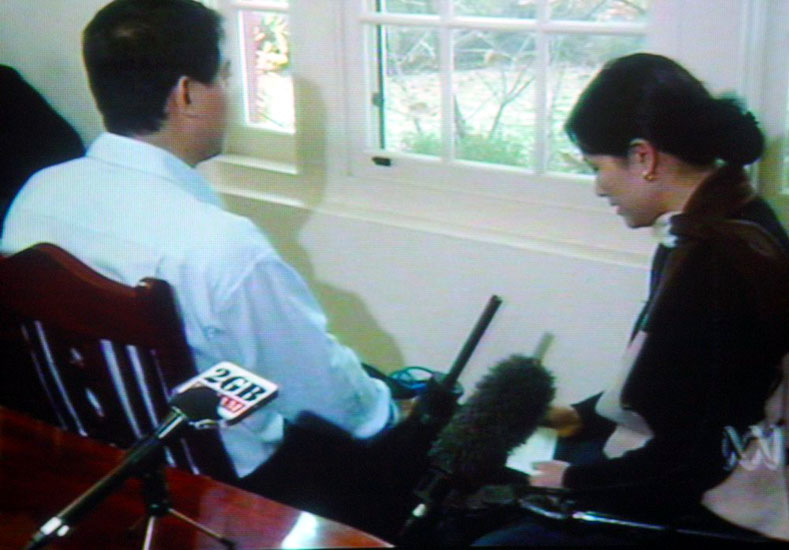 ![]() 澳洲ABC电视台6月9日晚间夜线节目画面,郝凤军在堪培拉背对镜头接受采访,旁为英文翻译员。 |