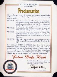 因此,我,宾夕法尼亚州伊斯顿市市长菲利普•米特门,特此称赞修炼法轮功的人们寻求丰富他们的生活,并和平抵抗对他们人权的不公正侵犯;同时敦促中华人民共和国立刻停止对法轮功的迫害;并颁发本鼓励公告,宣布2005年6月6日至12日为