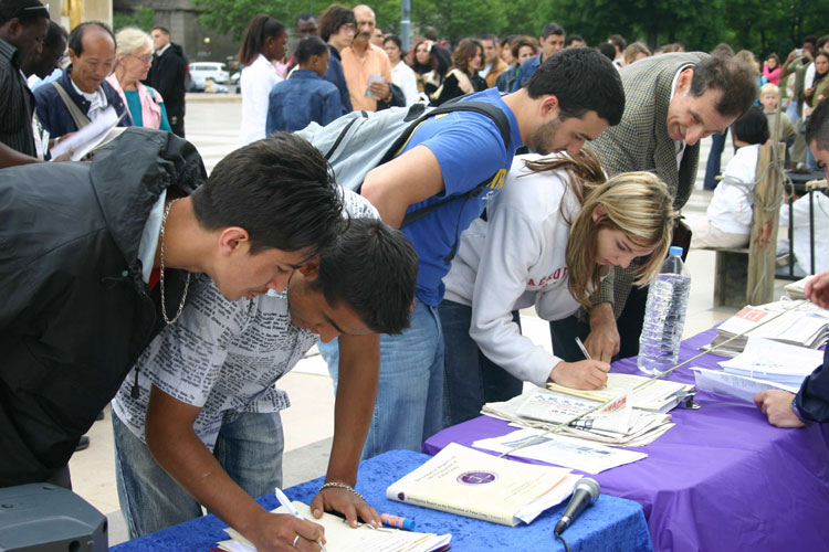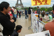 2005年6月5日星期天,新!唐!人:电视台举行要求欧洲卫星公司抵制中共压力续约和声援两百万人退!党!的活动。新!唐!人:电视台是一个勇于说真话的独立的电视台,法轮功真象是新!唐!人:电视台报道的内容之一,因而部份法轮功学员也应邀参加了新!唐!人:的活动,他们分别来自比利时、丹麦、瑞典、英国、德国等。他们以真人模拟的方式揭露中共江氏集团以酷刑迫害中国法轮功学员,现场还有图文并茂的展板,既展示了法轮大法在世界上洪传的盛况,又把中共迫害善良的大法弟子的真象暴露在光天化日之下。一批又一批的游客细细阅读展板的内容,其中也不乏当地的华侨和大陆游客。途经的游客对二十一世纪仍有如此残暴的迫害表示震惊,纷纷在征签布上签名以示支持新!唐!人:电视台及支持信息自由、声援退!党!。