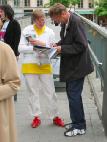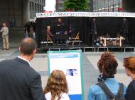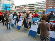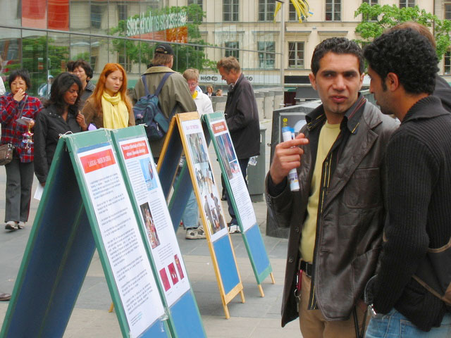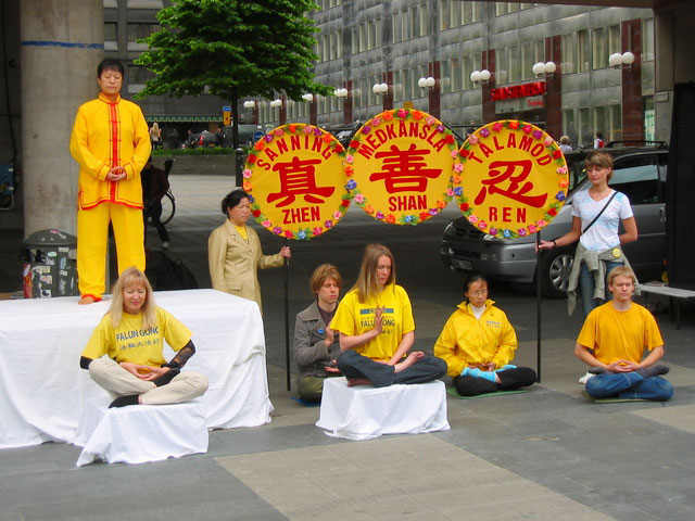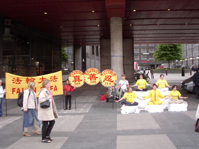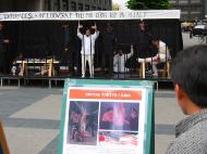 酷刑演示的另一侧是在优美的炼功音乐伴随下祥和的炼功场面。这与一旁的酷刑演示形成了强烈的反差。这也是生活在民主国家的人民难以将两个画面联系起来的不解疑问。在演示前方排列着法轮大法简介和反酷刑展板,很多人一边看着展板一边对照着对面的演示,人们简直难以相信这一事实--在中国正发生着针对这样一群平和善良人们的残酷迫害。