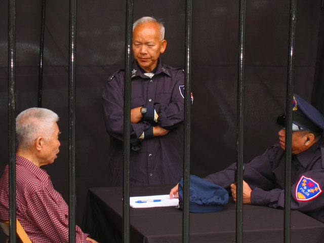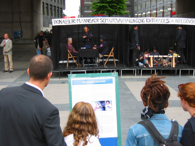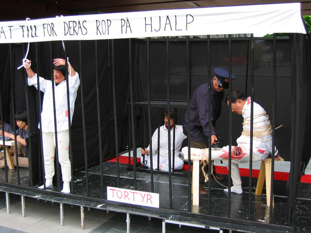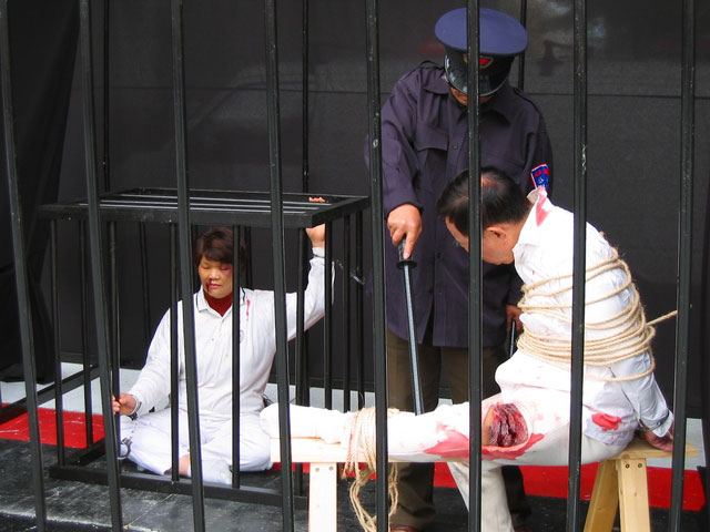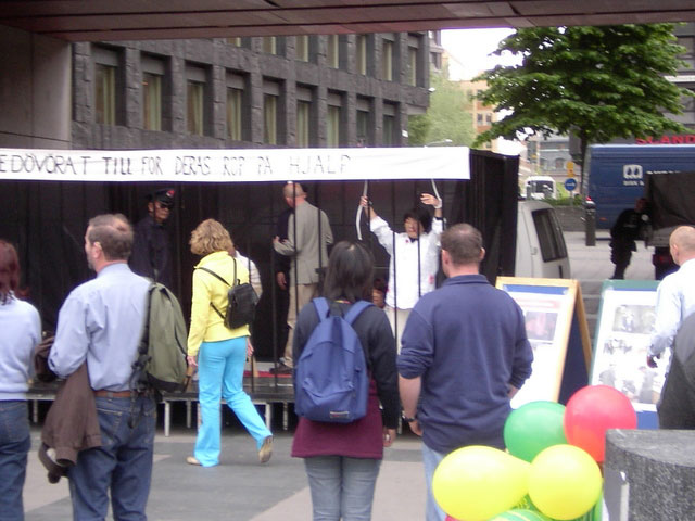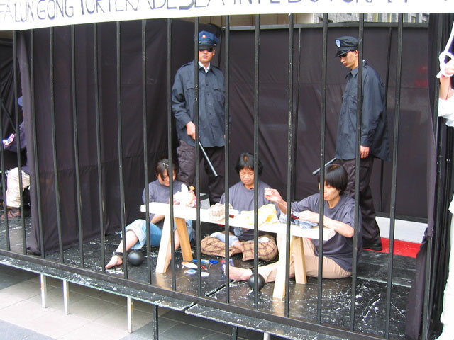 演示现场安放了三个铁笼,分别展示强制洗脑、奴工和酷刑,在酷刑笼内又分别演示了吊刑、关小号和老虎凳。笼内不断传出恶警对法轮功学员的粗暴训斥声和受酷刑后学员悲惨的叫声以及有的学员发自肺腑的“法轮大法好!”的呼声。