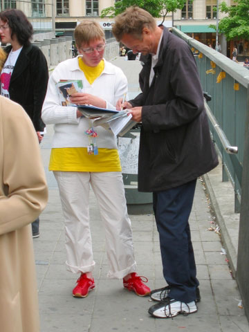 学员们向过往行人递送真象资料并回答人们的提问,看到小朋友或老人时,还亲切的送上一朵精致的纸莲花表示法轮大法弟子对人们的美好祝福。