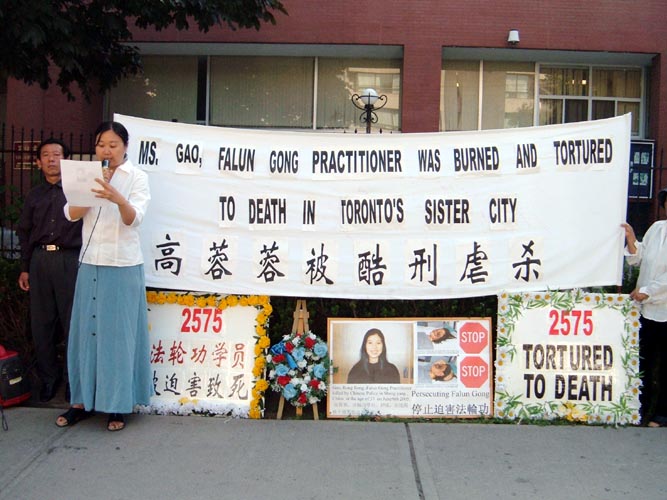高蓉蓉原是辽宁沈阳鲁迅美术学院职工,因坚持修炼法轮功,从2003年6月22日被当地警察从自家门口绑架后,饱受了两年的迫害之苦,于2005年6月16日在位于沈阳的中国医科大学第一附属医院急诊室去世。在被非法监禁和劳教中,她被毒打致一只耳朵失聪,被电击近7小时致毁容,被折磨的全身器官衰竭、骨瘦如柴,生命垂危。高蓉蓉一度被大法弟子成功营救,并将迫害真象揭露出来。但“610”头目罗干亲自指令抓捕,实施报复。高蓉蓉不幸于2005年3月再次被绑架,直至被迫害致死。