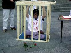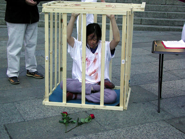 约中午十一点半,扮演受酷刑的学员在酷刑笼子里、炽热的阳光下已经烤晒了有一小时许,我忽然瞥见一个西方人正把两朵红色的玫瑰花轻轻摆放在笼子前。原来是几个西方游客在听闻一位学员讲清法轮功真象后,为学员所付出的努力所触动而做出的感人之举。