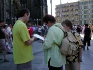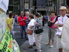 18日这天的科隆一扫多日来的不晴不阴天气,这个周末晴天,烈日当空,炽热的阳光十分烤人。我们的展台全在炎热的阳光照射下,因为这个地理位置很有利于我们的活动,凡来参观大教堂的人几乎没有看不到我们展台的。一如往常,这里的周末总是游人涌动,摩肩接踵。