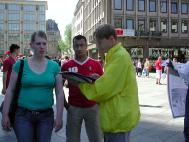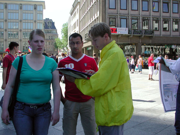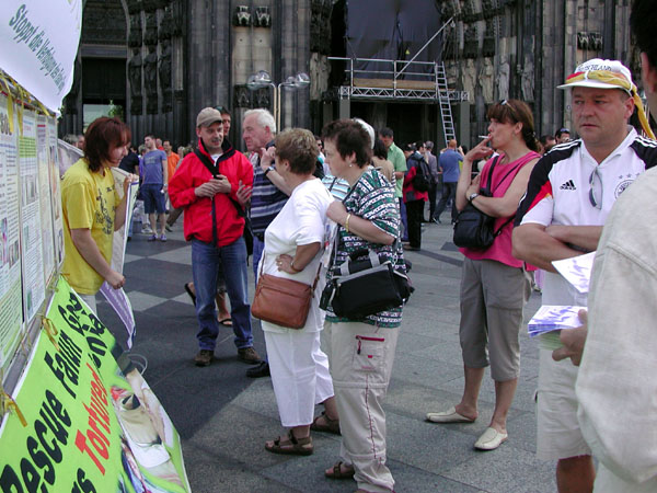 在向一位中年德国妇女讲真象时,她说对中共迫害法轮功已经有所了解,实在太不可思议。在欣然接受了德文真象传单后看着中文材料说,“也请给我一些中文材料,我家的保姆是中国人,我要拿给她看”,于是我又把各种中文真象材料给了她一份。这还似乎不够,她又拉着孩子到真人模拟酷刑展和真象展板前去了。