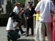 约在下午三、四点时,看到一个人正抱着个大摄像机在拍摄我们的模拟酷刑演示,还把长镜头伸進笼子给扮演受刑学员拍特写镜头。我看到他胸前挂着带有照片的工作证,也不象德国人,问他是那个电视台的,他说是墨西哥某台。我注意到他周围有好几个挂同样胸牌的人。看起来这是一个很大规模电视台的工作人员。