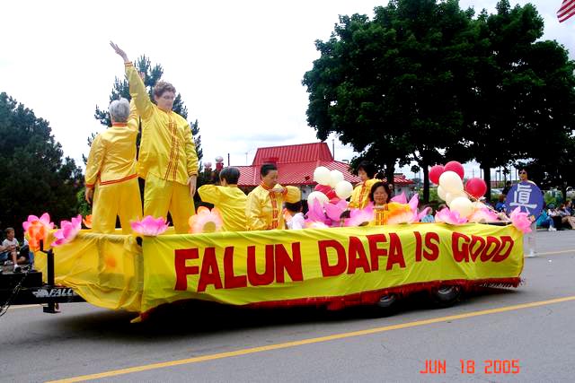 法轮功团队由三部份组成,首先开路的是装饰着法轮大法横幅的大车,车后拖一辆学员们亲手装饰的花车。花车两侧有“法轮大法好”的横幅装饰,五个大字在阳光下闪闪发光。花车上有一朵大莲花,其中坐一位女弟子盘腿打坐,莲花旁有几位弟子一起演示“神通加持法”。花车前方有两名白人学员连续演示“佛展千手法”,“贯通两极法”和“法轮周天法”。