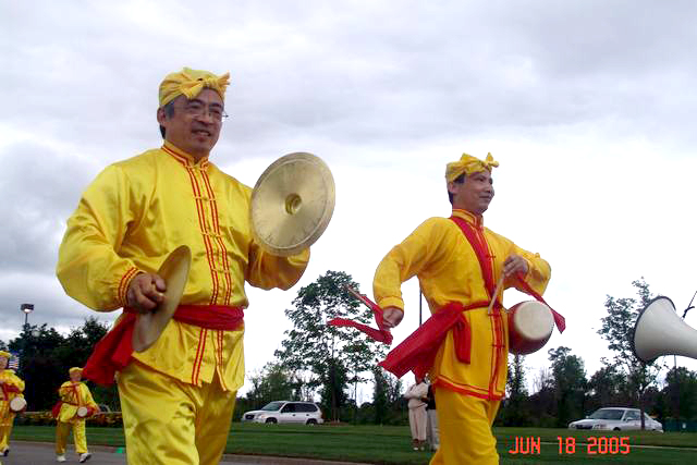 游行队伍中,最受瞩目的是声势浩大的法轮功腰鼓队。身着金色炼功服,脚蹬白靴,一个个昂首挺胸,四路纵队,老少齐上阵,鼓声震耳,场面既热闹又有一番特殊的庄重。