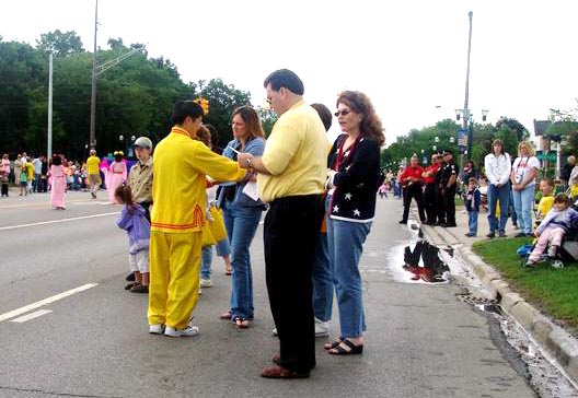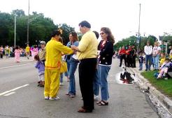 在队伍外的学员,有的发放真象传单,有的跟在场的媒体讲中共迫害法轮功的真象。在一英里的游行中,发出了大量真象传单,很多观众都很认真的阅读。