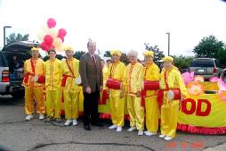 康东市的联邦国会议员麦克特,作为民意代表也参加了游行;他不久前联名签署了支持法轮功的决议案,学员感谢他对法轮功的支持,并与他合影留念。