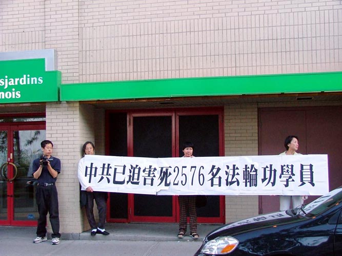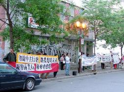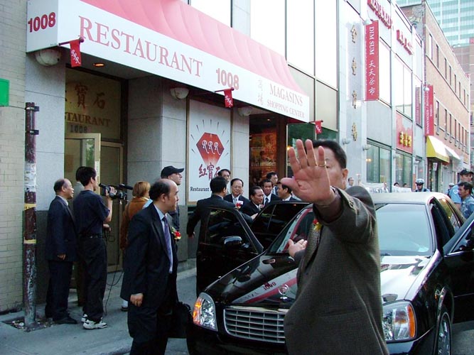 宴会推迟1个多小时,大使的车早已到达,在离酒楼几百米处停了许久也没办法绕过法轮功学员的请愿队伍,最后硬着头皮进去了。而且几个华人男子强行阻止记者拍照。