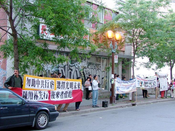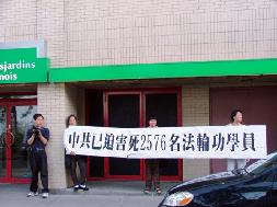 法轮功学员在现场展示高蓉蓉因坚持信仰被电击毁容的照片,并打出多幅横幅:“公然虐杀高蓉蓉天理不容”、“中共毁容于前 虐杀于后”、“中共迫害死2576名法轮功学员”、“立即停止迫害法轮功”、“严惩凶手”、“勿助中共行虐 选择光明未来”、“陈用林先行 后来者当追”等,许多前来参加宴会的社团侨胞都在观看,有些人躲在酒楼的玻璃窗后观看。