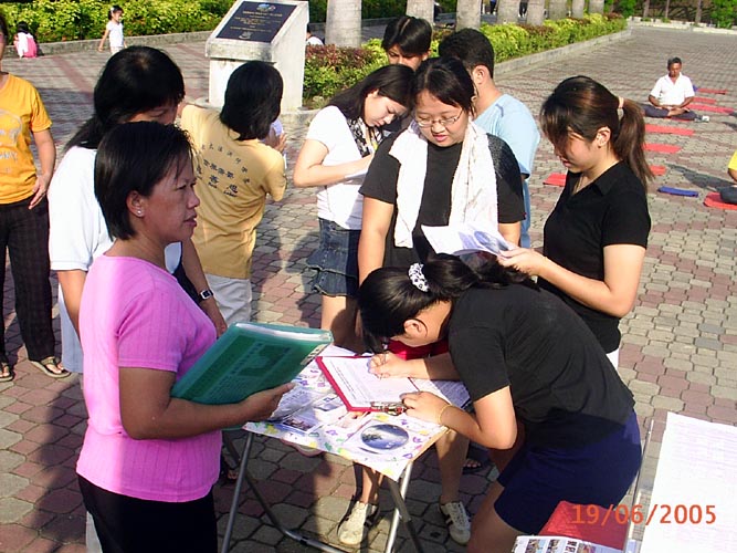 【明慧网2005年6月23日】为了让人们進一步了解中共对法轮功的目前还在延续着,马来西亚法轮功学员定于2005年6月19日早上,再次到人潮众多的雪兰莪州吧生市人民公园举行反展。在此之前,学员写了书信通知当地市政府。当学员去提交书信时,市政局的公关小姐一下就认得学员。学员跟公关小姐提起我们要再一次于人民公园办反酷刑展。公关小姐很开心的接收了书信。
