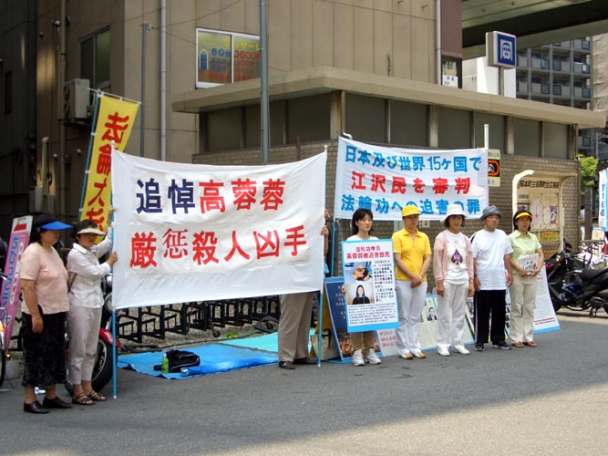 【明慧网2005年6月23日】日本近畿法轮功学员惊悉因散发法轮功资料而受到中共恶警电击致使其脸部严重变形的法轮功学员高蓉蓉,最近被丧心病狂的中共当局摧残致死。为了抗议中共用虐杀法轮功学员的暴行,近畿法轮功学员于2005年6月21日上午,赶到中国驻大阪总领事馆,对中共失去理智的疯狂表示抗议并同时悼念被迫害致死的法轮功女学员高蓉蓉。