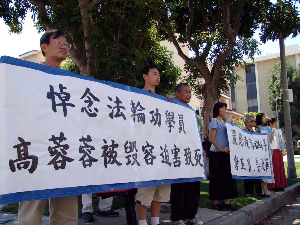 与会者打出“严惩迫害高蓉蓉致死主谋罗干及凶手”、“严惩毁容凶手唐玉宝、姜兆华”、“呼吁中领馆员工支持陈用林告别中共 停止迫害法轮功”等横幅,以及高蓉蓉的遗像和被毁容的照片。著名民运人士、《中国事务》网站主编伍凡、国际大赦组织克莱蒙学院分部负责人 Sarah Cook、法轮功学员代表吴英年、李有甫和 Brad Carson在集会上讲话。