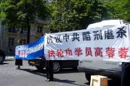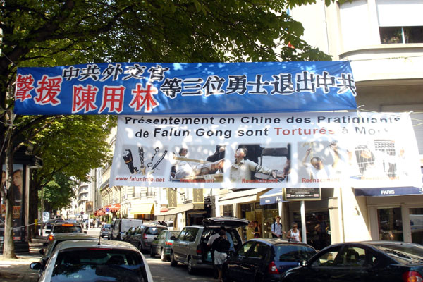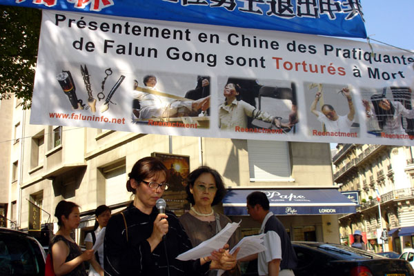 法轮功学员在使馆前除了炼功,发正念,向过往的行人分发真象传单外,还用中文和法文宣读了中共迫害高蓉蓉致死的事实以及最近在澳大利亚投诚的三位前中共官员亲眼见证或亲身经历的中共对法轮功的残酷迫害。并打出多幅横幅:“抗议中共酷刑虐杀法轮功学员高蓉蓉”,法文图片横幅“中国法轮功学员被酷刑致死”。