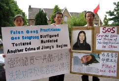 法轮功学员在中领馆前展开写有“强烈抗议中共酷刑虐杀法轮功学员高蓉蓉的暴行”以及“严惩凶手唐玉宝,姜兆华”的横幅,同时展开印有高蓉蓉被迫害前以及被迫害后照片的展板,揭露中共暴行,揭示高蓉蓉被迫害致死的真象。除此之外,法轮功学员们也展示了许多中共迫害法轮功学员所采用的酷刑的图片。