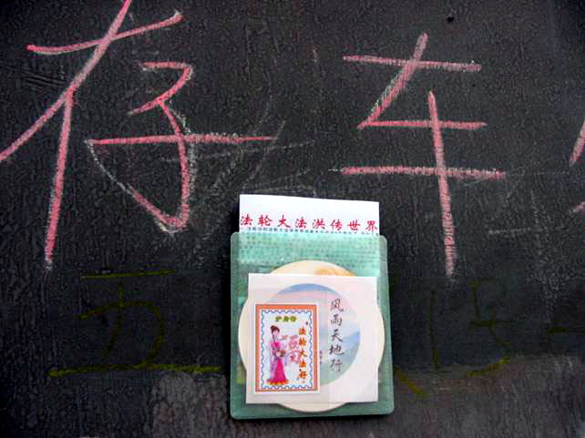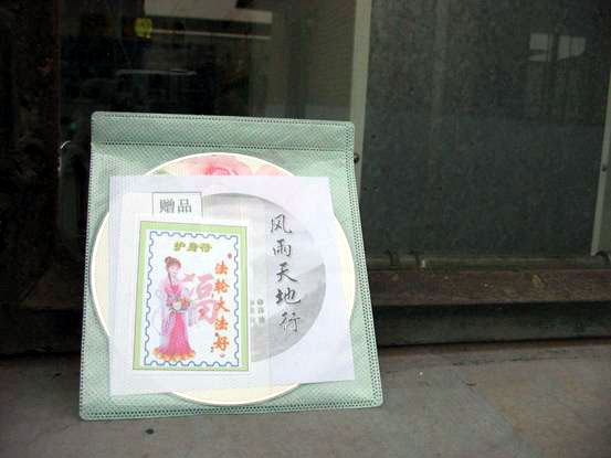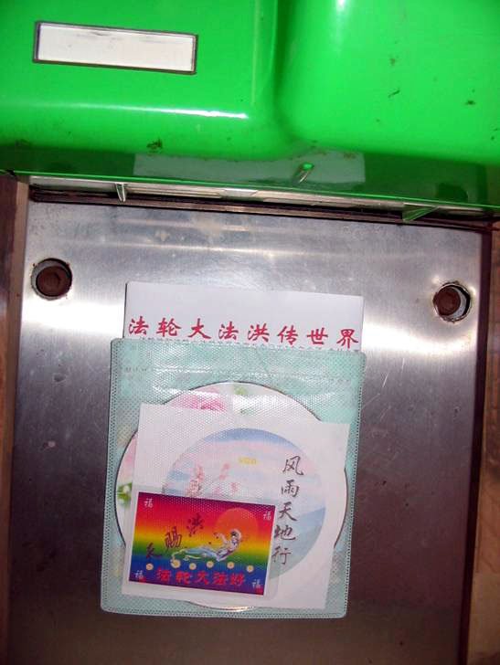 太原市委、市政府附近电话亭里的真象光盘、传单、护身符卡片组合
