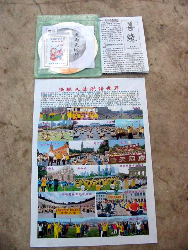 太原白桦苑小区花园里的真象宣传画、传单、光盘和护身符卡片组合