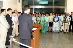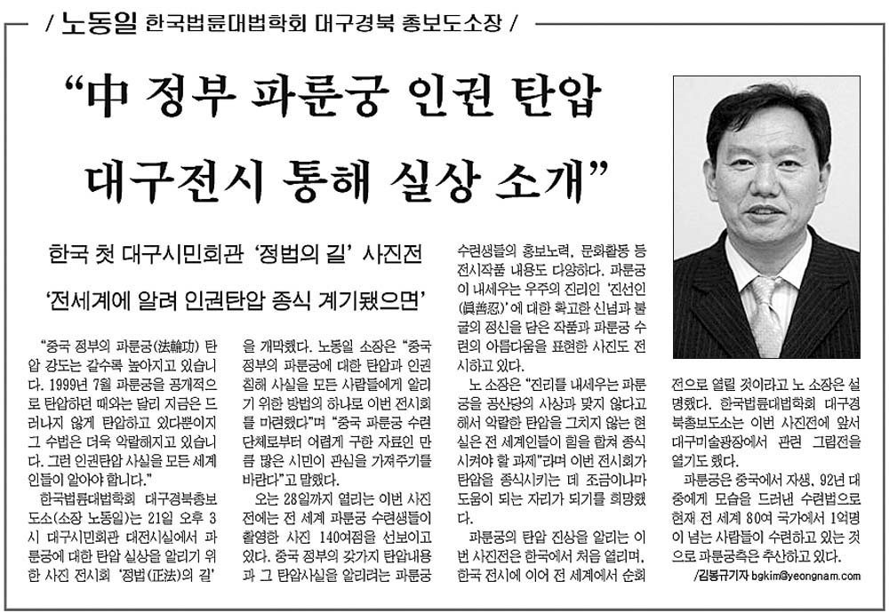 大邱庆北总辅导站卢东日博士,在开幕词中,介绍摄影展宗旨时说:“本展示会,旨在传播法轮功所遵循的“真善忍”宇宙真理。6年来,中共欺瞒世人对法轮功学员進行了残酷迫害;但中国和世界各地的大法弟子以坚忍不屈的精神反迫害的壮举震撼天地。为阻止中共这一罪行,世界各地举行了游行、集会、记者招待会、反酷刑演示,文艺演出等一系列和平请愿活动。今天我们捕捉这些真实的瞬间,并将他们载入史册。”