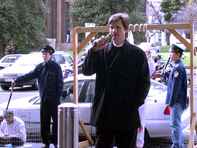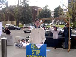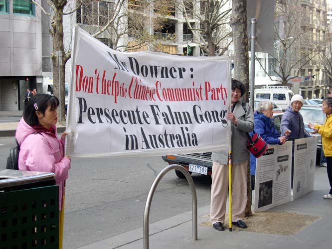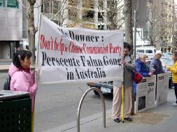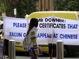 法轮功学员西蒙在集会上发言说:“我们今天在这里集会是因为澳洲外长唐纳还在签发限制法轮功学员在中国大使馆前请愿的证书。中共镇压法轮功已经六年,外长唐纳签发此证书已有三年,这是违反澳洲言论自由的法律的。”