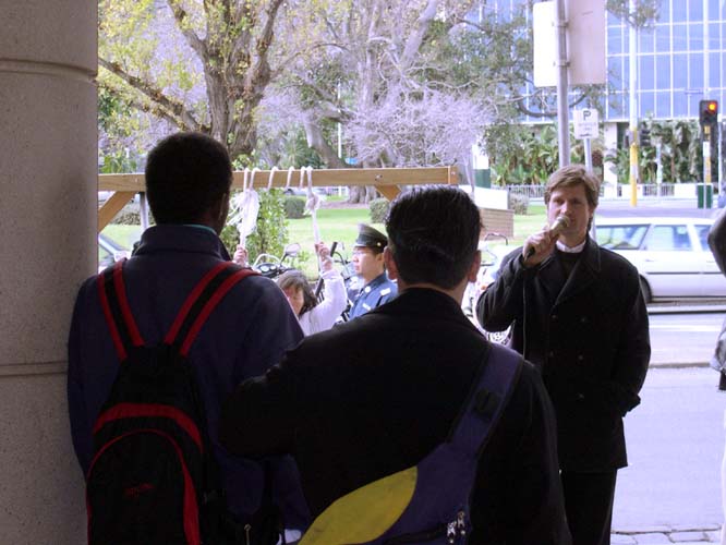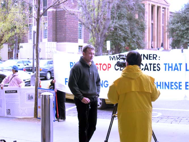一位过路的澳大利亚人男子说:“我认为唐纳不许法轮功学员在中国大使馆前请愿是站不住脚的,为什么新西兰的人可以在新西兰使馆前请愿,印度人可以在印度使馆前请愿,法轮功学员当然也可以在中国使馆前请愿。