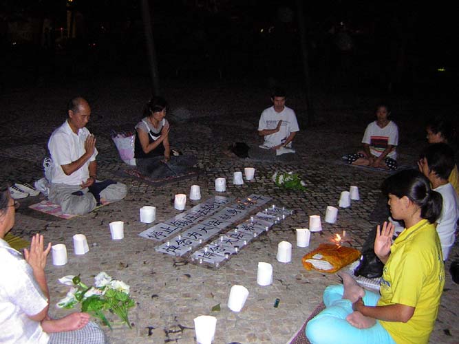 6月25日晚,澳门法轮功学员在中联办对面的花园里举行烛光晚会,沉痛悼念高蓉蓉,谴责中共又一惨无人道的行为。6年来,中国大陆不断的传出大法弟子被虐杀的消息,据明慧网统计的资料显示,高蓉蓉是已被证实迫害致死的第2575位大法弟子,也是辽宁省沈阳市被迫害致死的第54位大法弟子,这是中共的又一笔血债。为此澳门法轮功学员呼吁严惩直接策划的凶手罗干和直接参与迫害的龙山劳动教养院二大队副大队长唐玉宝、队长姜兆华,呼吁释放因曾营救高蓉蓉而被关押的数位大法弟子和在中国大陆所有被无辜关押的大法弟子。