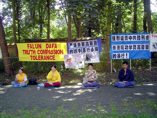【明慧网2005年6月28日】2005年6月26日下午,荷兰法轮功学员在海牙的中使馆前责令严惩虐杀高蓉蓉的凶手。路过的人们对此虐杀案深感震惊,表示要好好阅读法轮功学员提供的免费真象资料。