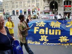 在巴黎北部商业中心洪法讲真象(图) 2005年6月25日,巴黎巡回洪法讲真象进行到了第七站,法国法轮功学员们在巴黎圣•拉扎尔火车站旁的卡布里埃尔•贝尼广场举行了活动。