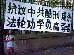 图片报道:匈牙利法轮功学员抗议中共虐杀 2005年6月25日下午,法轮功学员在中国驻匈牙利大使馆前请愿,揭露中共残酷迫害法轮功的事实真象,抗议中共对高蓉蓉等法轮功学员残酷虐杀的暴行,呼吁严惩凶手,停止虐杀。