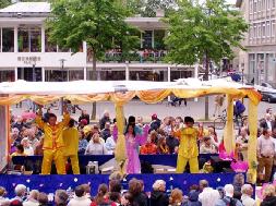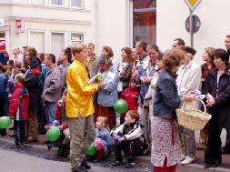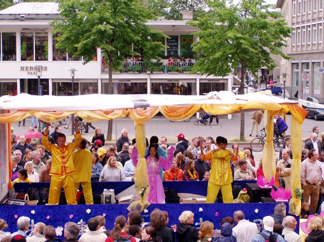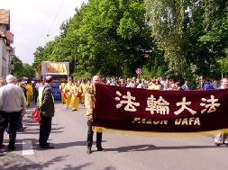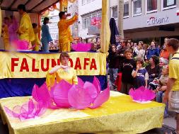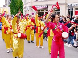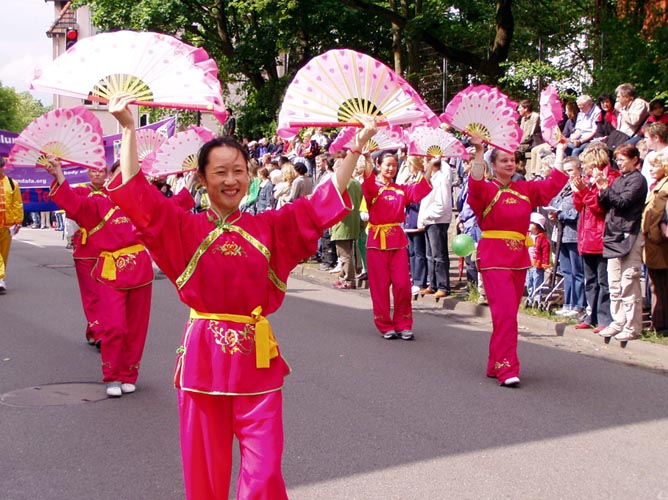 这天很早,比勒费尔德及周边城市的法轮功学员就赶到了活动地点开始准备活动。一些忙着布置和装饰彩车,剩下的人努力的排练游行中的舞蹈和打腰鼓。下午3点钟游行开始了:法轮功学员的方阵以腰鼓队领路,紧接着是彩车上学员们展示功法,后面是带有浓郁中国特色的扇子舞队。