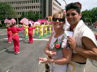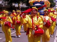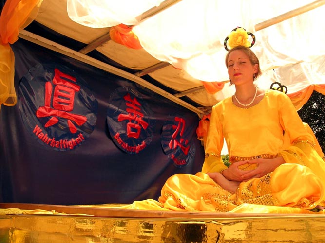 法轮功的游行队伍 |   法轮功的花车上打坐的德国女孩Caroline |