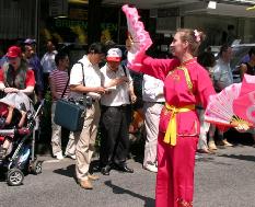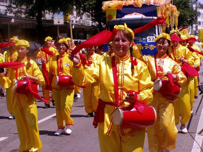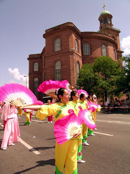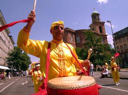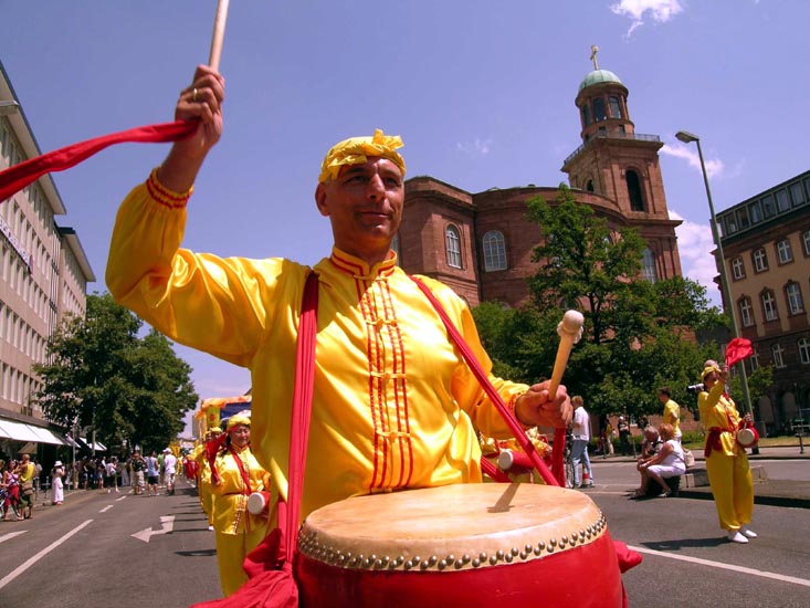 法兰克福的标志性建筑物保尔教堂前的中国传统舞蹈 |   女鼓手 |   观众高兴的和法轮功的游行队伍合影 |