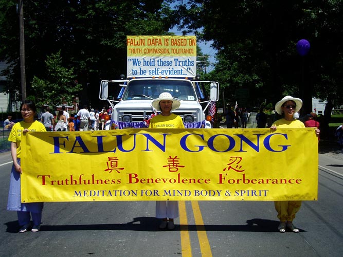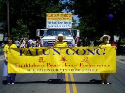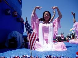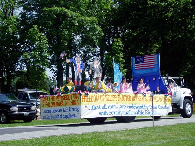 ![]() 花车上的花仙舞 | ![]() 参加独立日的法轮功团体花车 |