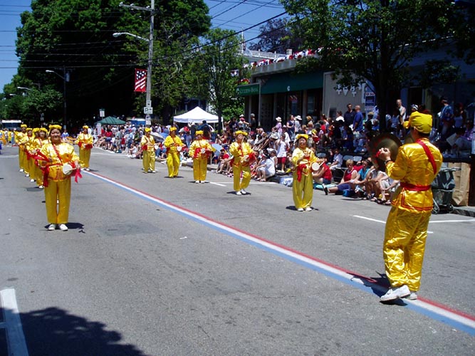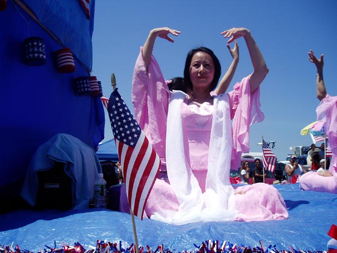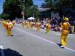 今年的独立日,蓝蓝的天空洒下灿烂的阳光在每个大法弟子的身上,法轮功的游行队伍以美国特色的花车及中国传统文化的腰鼓队和仙女队为主。花车上有老、中、青、幼不同年龄的大法弟子演示五套 功法,还有四位装扮成美丽的莲花仙女,盘着腿,舞动着优美的“花仙舞”。路旁的游人惊喜的欢呼着:“BEAUTIFUL! BEAUTIFUL!”(太美了!太美了!)还有的人学起了“花仙舞”的动作。