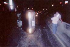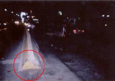 ![]() 红色记号处即为突出的分隔岛 | ![]() 约4点15分撞上打转翻车后,车子侧立着 |