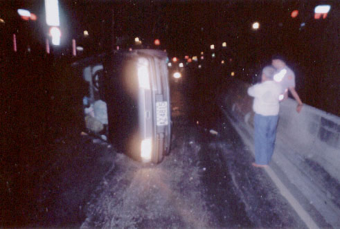 爸爸说,那天早上轮到他去新竹市载报纸,清晨3:30从新竹县二重埔出发,约4点抵达,将报纸叠好上车即开往回家的路。由于天色很黑看不清楚,路上没有什么车,他以时速60-70公里的速度行驶,经过科学园区大门前时,突然看到前方突出约2尺的安全岛,这时踩煞车已来不及了,整车以70公里的时速冲撞过去,一声巨响──砰,车子随即打转滑行四、五公尺远后翻车,左边驾驶座朝上倒立着。