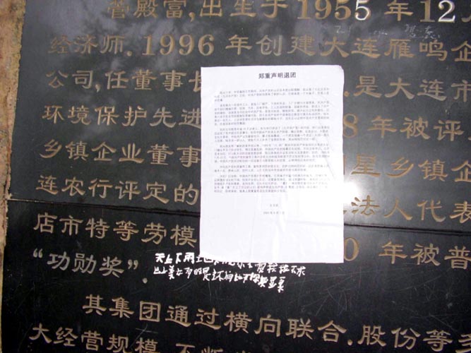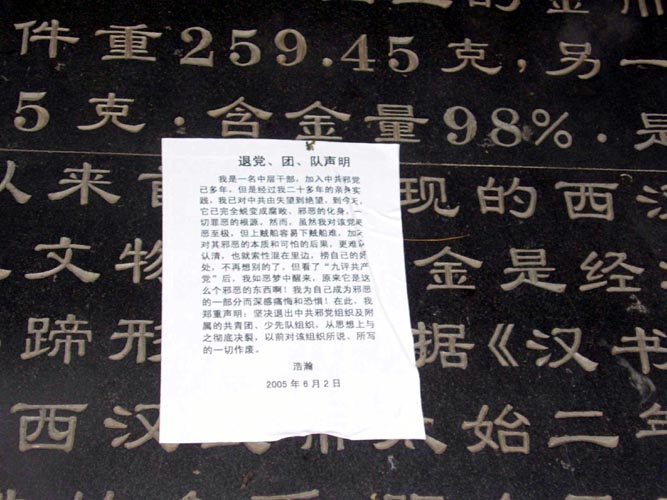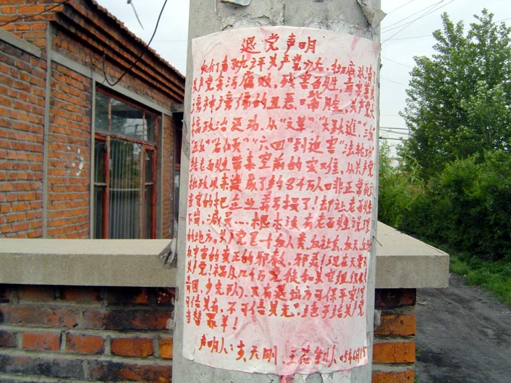 2005年6月15日,在七台河市茄子河区街头的水泥电杆上出现了退!党!声明。如图: