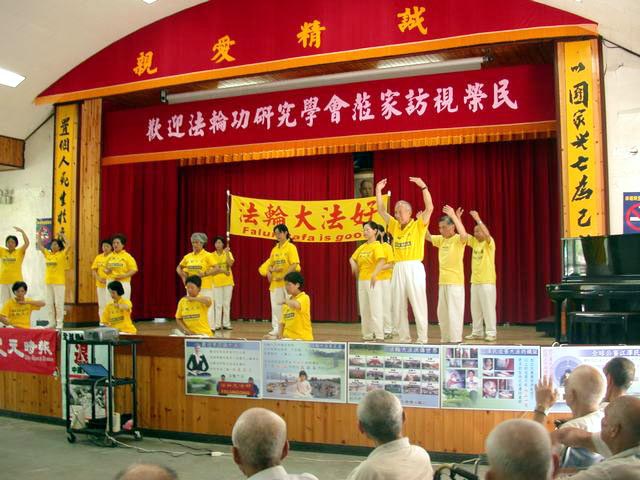 访问活动当天上午九时正式开始,一早就有许多荣民及员工在会场等候,也有部份荣民坐着轮椅、拄着拐杖赶来参加。学员在会场布置了大法洪传及在大陆受迫害的多幅真象看板,吸引了大家的目光并驻足观看。
