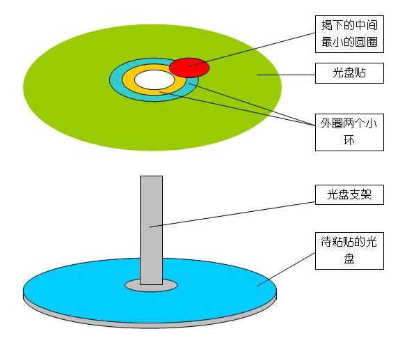 明慧文章《参考资料:〈·九·评*〉VCD光碟标签封面》(2005年3月26日)、《应重视光盘封面的作用》(2005年6月2日)和《给制作·九·评*光盘贴的同修的建议》(2005年6月4日)中同修们广泛探讨了光盘贴,这里针对为保证光盘贴图案内涵的完整和完美性,只去掉中间最小的圆圈,介绍一种简单快速粘贴方法。