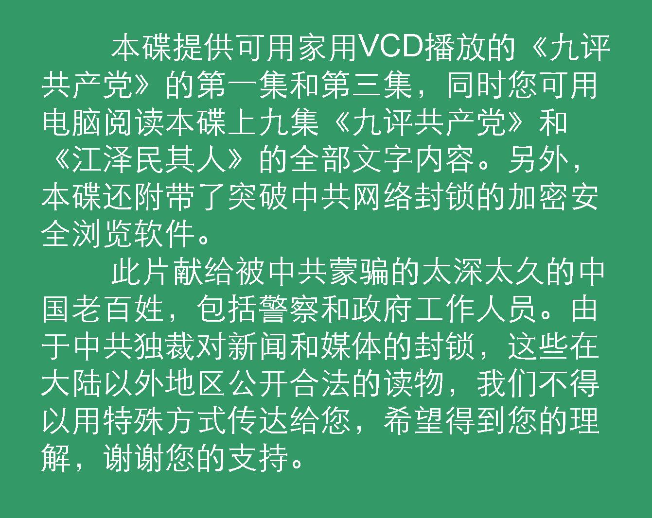 “本碟提供可用家用VCD播放的《·九·评*共产党》的第一集和第三集,同时您可用电脑阅读本碟上九集《·九·评*共产党》和《江泽民其人》的全部文字内容。另外,本碟还附带了突破中共网络封锁的加密安全浏览软件。