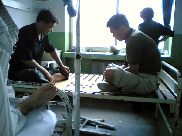 上图中下棋的是非法在医院看管傅新立的招远610人员。