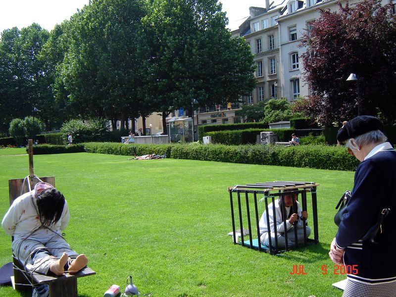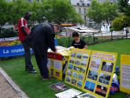 展位位于市中心公园的一片绿地上。今天天气晴朗,和风习习,周末的行人很多,揭露中共迫害法轮功的真人模拟反酷刑展及其相关的图片介绍触动着每个过往行人的心灵深处。