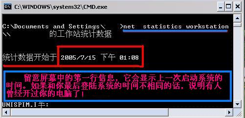 2.运行后,我们可以留意屏幕中的第一行信息,它会显示上一次启动系统的时间,如果和你最后登陆系统的时间不相同的话,说明有人曾经开过你的电脑了。