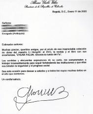 贝莱斯总统在信中说,亲爱的朋友,非常感谢你们,将李洪志老师的珍贵著作、真象光碟、杂志和《转法轮》寄给我。 贝莱斯说,这些感人的材料将激励我更加努力的致力于社会的进步和安定。在此,我祝你们未来的努力成功。