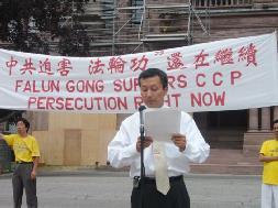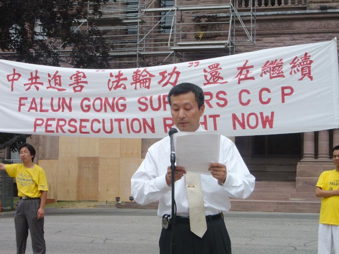 多伦多法轮大法佛学会的代表张照进在演讲中表示,法轮功学员通过六年的不断讲真象,加拿大上至政府下至普通民众都越来越支持和帮助法轮功。在中国遭受迫害的何立志受迫害被释放后,他的移民纸已经过期,后来就是在加拿大各级政府和议员的帮助下顺利来到多伦多和妻子团聚的。但是,中共对法轮功的迫害还在继续,目前证实被迫害致死的法轮功学员已达2685人。