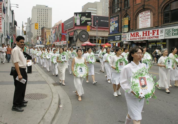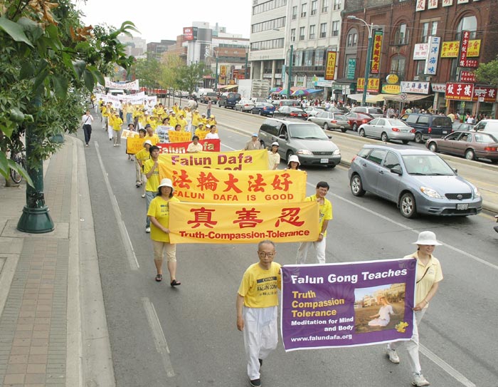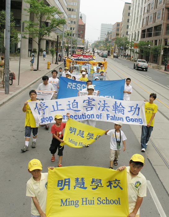集会后的游行由几个不同的方阵组成:法轮大法好和法轮大法在加拿大;功法表演;白衣方阵:由身穿一袭白衣,手捧被迫害致死的学员照片的法轮功学员组成;营救孤儿:由明慧学校的小弟子参加;反酷刑展等。与以往不同的是这次还有法轮功之友及支持者的方阵,格外引人注目