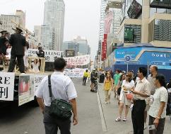 ![]() 反酷刑展经过街头 | ![]() 游行队伍经过唐人街 |